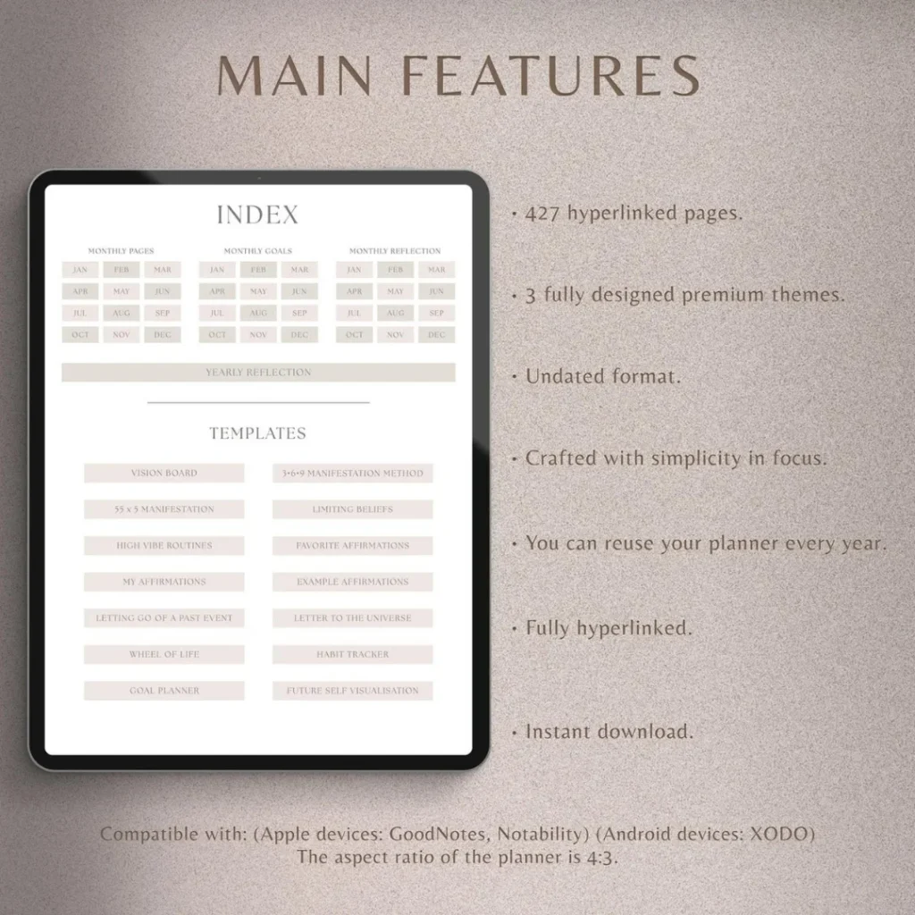 ❗️Please note that the planner has a 4:3 aspect ratio, like all iPads. If your tablet has a different aspect ratio, the planner may have different proportions and may not fill the entire screen.